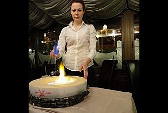 Avant l'arrivée du plat, de délicats amuse-bouche sont servis. L'arrivée des Leggera di taglioni Romantica est d'abord un plaisir des yeux. La préparation des linguines flambées à la crème de sauge, plat qui fait la réputation de cette maison ouverte depuis 21 ans, se termine en salle. Du Brandy est flambé directement dans la meule de parmesan. La serveuse joue de sa cuillère, gratte le parmesan fondu, creuse un réceptacle pour accueillir ensuite les pâtes. La sauce à la sauge encore fumante est versée sur le tout puis mélangée. Le régal des yeux terminé, place à l'explosion de saveurs !