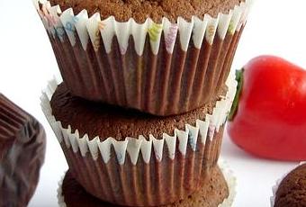 Je suis une fan de poivron rouge, en mezze turc comme ici. J'avais déja essayé et aimé le mélange chocolat courgette là. Ici, l'association surprenante du chocolat et du poivron rouge donne un résultat délicieux et les cakes deviennent encore plus fondant le lendemain... si on a le courage d'attendre! La recette vient de chez Angélique, auteur talentueuse du Palais des Lys. J'ai (involontairement) modifié sa recette en oubliant de monter les blancs en neige.