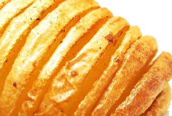 > Posez votre pomme de terre à plat (faites au mieux !) et entaillez la pomme de terre en tranches fines tout en laissant un peu de base afin que la pomme de terre reste entière. Sur certains site, ils placent des baguettes chinoises des deux côtés de la pomme de terre afin de couper plus rapidement et sans détacher les tranches : les baguettes servent de bute.