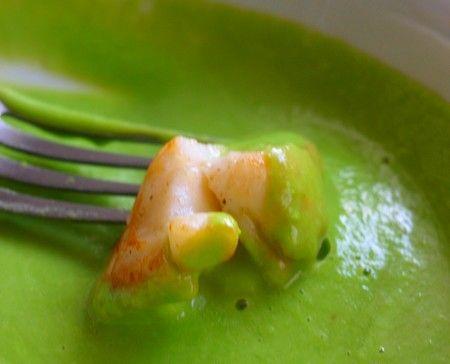 Le velouté enveloppe accroche bien à la Saint-Jacques, se faufilant dans la moindre de ses anfractuosités. Pour la couleur et le goût, j'ai ajouté aussi un reste de "poudre de petit pois".
