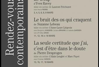 Dans cette optique, le Vieux Colombier propose donc au mois de mars ses "Rendez-Vous Comtemporains", regroupant sous cet intitulé, pour une série très limitée de représentations, plusieurs coups de coeur du bureau des lecteurs de l'institution de la place Colette ainsi que deux cartes blanches.