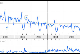 Le graphique précédent était en échelle relative, c'est à dire en fraction des recherches totales, mais le résultat n'est pas beaucoup plus réjouissant en échelle absolue sur la même période: