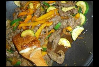 Rajouter les poivrons laisser cuire 3 min puis rajouter les courgettes et laisser cuire encore 3 min.