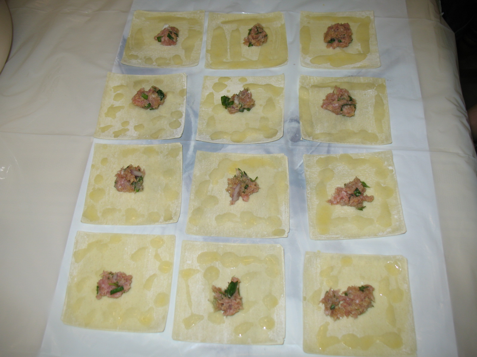 Étaler les pâtes Won Ton sur une surface. Battre un œuf avec 1 c. à table d’eau et avec un pinceau badigeonner les bords des pâtes Won Ton.