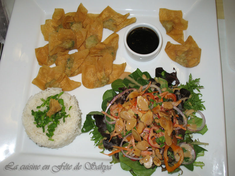 Des papillotes asiatiques avec sa sauce et une belle salade accompagnées d'un riz basmati. Voici le résultat d'un bon repas asiatique que ma fille, petite fille et moi avons préparés.C'est vraiment délicieux, un peu long à faire mais il en vaut vraiment la peine