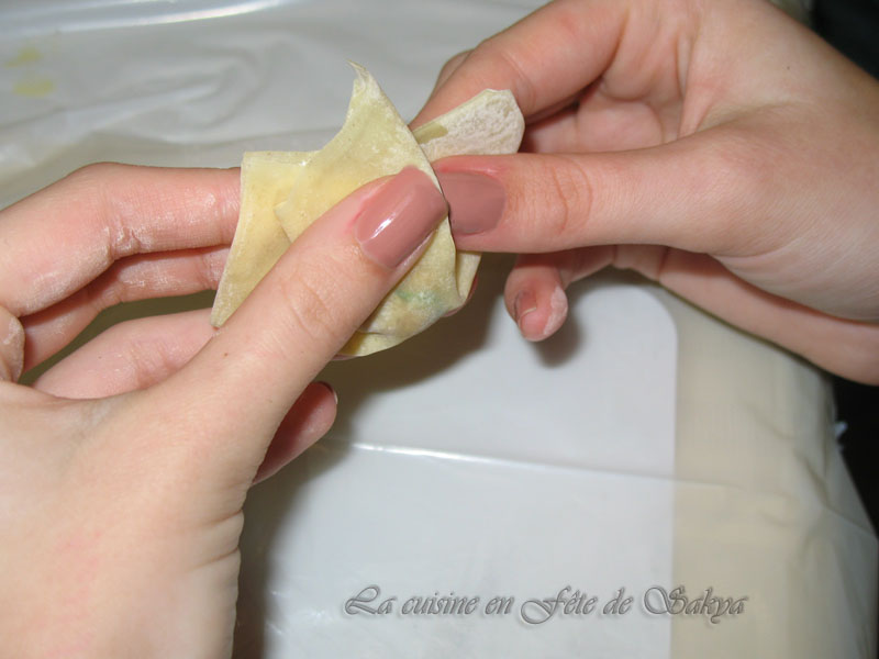 Ajouter environ ½ c’à thé du mélange de porc dans chacune des pâtes. Plier comme vous voyez sur les photos et recommencer le principe.