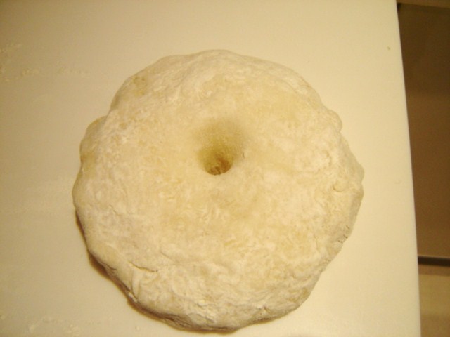 Prenez la boule de pâte faite, percez au centre pour faire une sorte de saucisson en cercle.