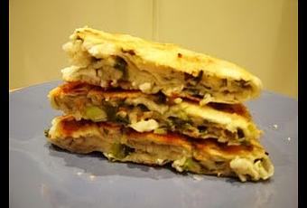 Ingrédients: 250 g de farine, 160-180 ml d'eau chaude (40-50°c), 200 g de ciboules, sel, poivre finement moulu, 2.5 c. à soupe d'huile végétale.