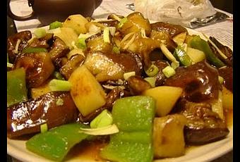 Étapes:1. Coupez les aubergines en grands morceaux, saupoudrez dessus de sel et mélangez, puis laissez reposez pendant au moins 30 mins. Ceci est pour faire sortir le jus de l'aubergine. 2. Coupez le poivron et la pdt en morceaux, à peu près de la même taille de celle de l'aubergine. 3. Hachez l'ail et les petits oignons.4. Préparez la sauce: mélangez la fécule avec sauce de soja, vinaigre, vin jaune, sucre, sel et poivre. Ajoutez de l'eau, bien mélanger le tout. 5. Pressez avec les mains les aubergines pour faire sortir le jus. On peut aussi le faire avec un torchon, enveloppez les morceaux d'aubergines avec le torchon, puis pressez. 6. Chauffez 2 c. à soupe d'huile, ajoutez l'ail et petits oignons, faites les revenir pendant 1 min avec un feu moyen. Ajoutez les aubergines, mélangez un peu, puis laissez cuire jusqu'à qu'ils soient tendres. 7. Sortez les aubergines, remettez le reste d'huile pour faire dorer les morceaux de pdt. Quand ils sont dorés, ajoutez le poivron, faite cuire ensemble pendant 2 à 3 mins. 8. Rajoutez les aubergines, faites cuire le mélange des trois légumes pendant encore 3 mins. Puis bien remuez la sauce et versez la dans la poêle. Touillez rapidement, quand la sauce commence à devenir liée et transparente, sortez tout de suite du feu et servez dans un plat.