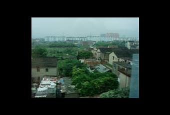 A la sortie de l’aéroport, nous empruntons le Maglev,[1] moyen le plus simple, rapide et impressionnant pour se rendre au cœur de la ville. Nous découvrons alors la banlieue périphérique de Shanghai, composée de barres d’immeubles et de champs de récoltes s’étalant sur des kilomètres.