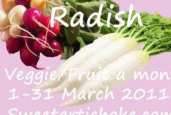 A Veggie/ Fruit a Month, is an event started by Priya of Mharo Rajasthan’s Recipes, and the veggie of the month of March 2011 is… Radish.