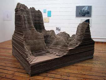 Abigail Reynolds, Mont Fear East London, 2002-3''The terrain of Mount Fear is generated by data sets relating to the frequency and position of urban crimes. Precise statistics are provided by the police. Each individual incident adds to the height of the model, forming a mountainous terrain.All Mount Fear models are built on the same principals. The imaginative fantasy space seemingly proposed by the scupture is subverted by the hard facts and logic of the criteria that shape it. The object does not describe an ideal other-worldly space separated from lived reality, but conversely describes in relentless detail the actuality of life on the city streets.''