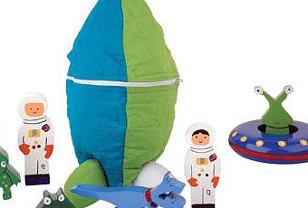 Fusée en tissu, dans laquelle on range tous les petits personnages, "animaux " et accessoires en bois