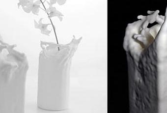 Action becomes Object : l’action devient objet. Telle est la devise qui a prévalu pour l’élaboration de ce vase nommé Fluid. Comme le montrent les deux vidéos qui suivent, la forme des vases est obtenu directement par expérimentation virtuelle. Un processus de remplissage d’un vase est modélisé par ordinateur. Le modélisateur peut régler différents paramétrages comme la forme du réceptacle, ou le débit du liquide de remplissage. Le programme décompose alors chaque instant du processus de remplissage (à raison de 500 images par seconde), et il suffit alors de réaliser un « arrêt sur image » captant la fugacité d’un instant à peine perceptible en temps réel. Il ne reste plus alors qu’à « imprimer » cet instant fugace, ce que l’on sait très bien faire aujourd’hui grâce aux technologies de pointe d’impression en 3D. Le vase Fluid est une création de Fung Kwok Pan pour Supabold.