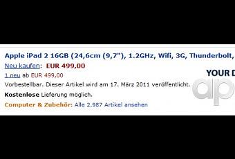 Amazon aurait en effet mis en ligne par erreur une fiche produit correspondant à l'iPad 2. Comme vous pouvez le voir, la fiche mentionne la présence d'une dalle 9,7 pouces, d'un processeur cadencé à 1.2 GHz, d'un port Thunberbolt ou encore une caméra. Quant à la disponibilité, elle est annoncée pour le 17 mars prochain.
