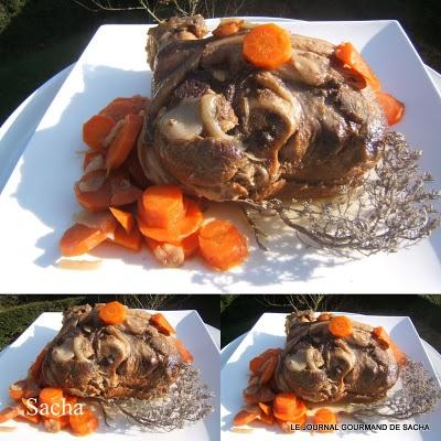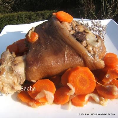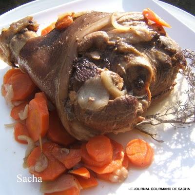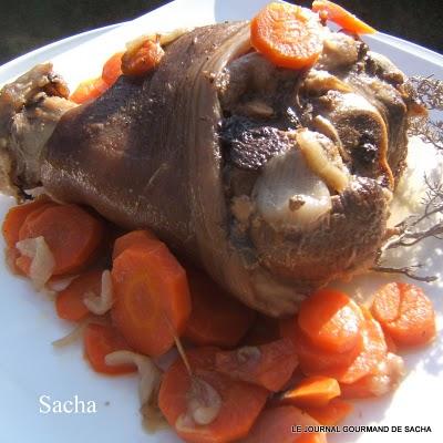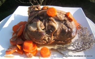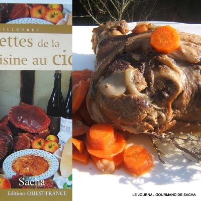 Jambonneau au cidre " comme autrefois "Recette pour : 6 perPréparation : 15 mn Cuisson : 2 heures Autres recettes :Jarret braisé à l'amer bière Jarret de porc aux lentilles du Puy tomates et thym Il faut : 1 jambonneau frais de 1.5 kg1 kg de petits navets 1 kg de carottes 3 oignons 30 g de beurre 2 pincée de sucre en poudre 2 pincée de cannelle 1 pincée de muscade 1 bouteille de cidre brut sel et poivre noir du moulin Préparation :Eplucher les navets , carottes , oignons Hacher finement les oignons Dans une cocotte en fonte faites fondre le beurre , ajouter les oignons émincés , remuer à la spatule puis ajouter les légumes coupés en rondelles , puis poser sur ce lit de légumes le jambonneau , saupoudrer de sucre , cannelle , muscade fraîchement râpée Saler et poivrer Arroser de cidre " la totalité de la bouteille " Couvrer la cocotte et metter à cuire à four moyen En cours de cuisson augmenter la chaleur du four à 220 ° et laisser cuire ainsi pendant 1 h 30 mn Egoutter le jambonneau puis le découper Présenter les morceaux sur un plat de service chaud entouré des légumes Verser le jus de cuisson dans une saucière Servez chaud