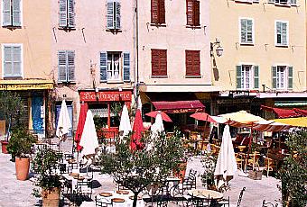 Place typique avec ses façades colorées, ses tables en plein soleil et les oliviers, bien sûr ...