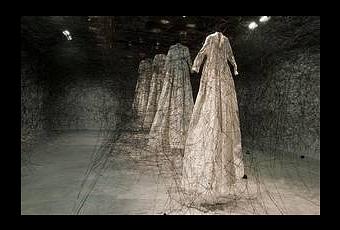 Après les cannibales, passant devant la ménagerie de Stéphane Thidet (qui, dans le passé, a fait mieux), on arrive (à la Maison Rouge jusqu’au 15 mai) dans un parcours monumental sous une voûte sombre comme un cauchemar et légère comme un rêve, faite de fils noirs tendus comme une toile d’araignée dans laquelle on craint de se faire prendre, plein d’appréhension au moment d’y pénétrer (”After the Dream”). Ces volumes mathématiques virtuels à la Poincaré, ces ancrages et ces envols, ces murs faits de vent mais impénétrables, constituent la trame d’un parcours circulaire étrange, oppressant et fascinant à la fois. Y flottent cinq robes blanches, cinq fantômes empesés de peinture, cinq désirs fantasmés, cinq sirènes tentatrices : pour venir les caresser, on franchirait le mur