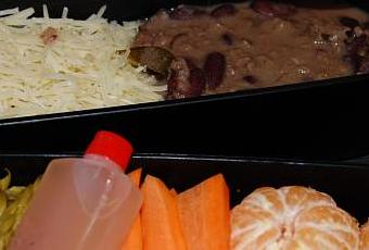 En haut: riz recouvert de gruyère rapé (qui fondra harmonieusement lors du passage au micro onde), chili con carne sans tomate et avec basilic.