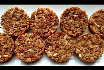 Concasser les poignons et les noix de pécan, les mélanger aux flocons et pavot. Ajouter le sucre vanillé et terminer par le sirop d'érable et le beurre fondu. Bien tout enrober. Disposer dans des moules en silicone, bien compresser et faire cuire à 180°C pendant 15 à 20 minutes. Bien laisser refroidir avant de démouler.
