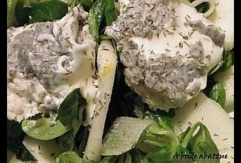 Une salade de mâche assaisonnée d'une huile de noisette, de gingembre et d'un vinaigre de muscat.Des tagliatelles de poire conférence.