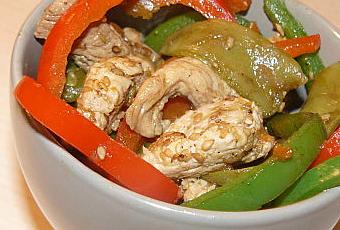 Couper les filets de poulet en morceaux, laver les poivrons et les couper en lamelles.