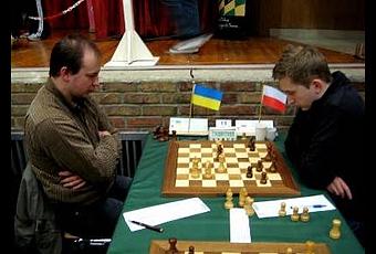 A gauche, l'Ukrainien Evgeni Sharapov aura pris un point entier au Polonais Grzegorz Gajewski lors de la ronde 2 © Photo Chess & Strategy.