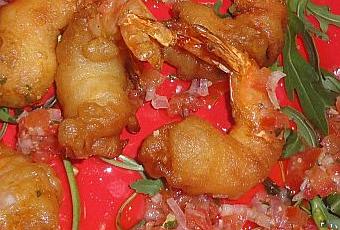 Mettre l’huile d’arachide dans une friteuse, faire chauffer à 170°C.Tremper chaque gambas dans