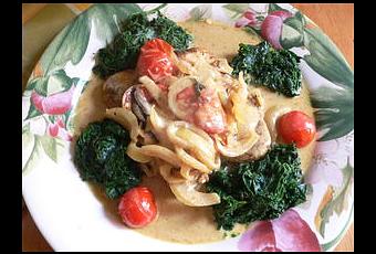 A la place de la viande, faire tomber les oignons et l'ail jusqu'à ce qu'ils deviennent tendres. Remettre les grenadins, quelques petites tomates-cerise, saupoudrer de piment d'Espelette. Mouiller d'un verre de vin blanc sec, couvrir et laisser mijoter six à sept minutes à feu très doux. Au bout de ce temps, mélanger hors du feu deux cuillerées à soupe de crème fraiche pour former la sauce. Vérifier l'assaisonnement.