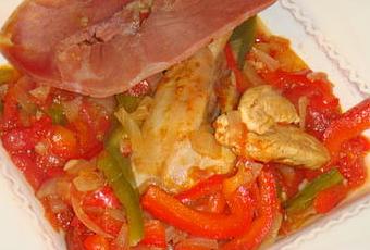 Allumez le gril du four. Lavez les poivrons et les faire griller sous le gril pendant environ 15 minutes en les retournant régulièrement, jusqu’à ce que la peau soit cloquée et noircie par endroits. Les laisser tiédir pendant 15 minutes dans un sac en plastique, puis les peler, les épépiner et les couper en lanière. Pelez et hachez les oignons. Pelez et écrasez l’ail. Coupez les tranches de jambon en 2. Otez la peau des morceaux de poulet.