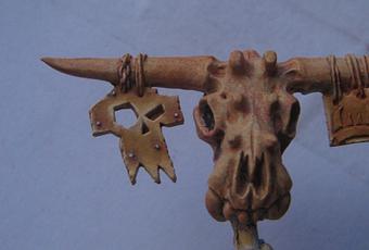 Aller zou on continue avec de l’ork, mais cette fois-ci place à un emblème ! C’est celui qui sera perché sur le dos de Ghazghkull, pour l’instant je n’ai peins que le glyphe à gauche, il reste encore tout à faire au niveau du crâne. C’est très agréable à peindre comme matière, j’ai essayé de peaufiner mes dégradés en préservant une dilution importante à chaque étape. Seront aussi ajoutées quelques traces d’usure pour simuler la rouille.