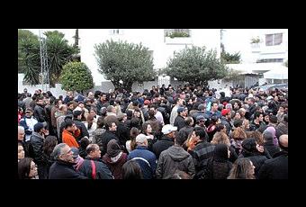Hier Monsieur Mohamed Ghanouchi a démissionné. Une heure plus tard, des milliers de personnes se sont rendus devant sa maison pour, soit refuser sa démission, soit lui rendre hommage. La plupart des participants sont des personnes adultes. Parmi eux, beaucoup de personnes âgées. Quelques enfants sont avec leurs parents. C’est dimanche. La manifestation est spontanée. Il n’y a pas de banderoles, à peine quelques papiers, quelques cartons sont agités. Il n’y a pas de slogans élaborés. Le quartier est entièrement quadrillés de soldats et de policiers.