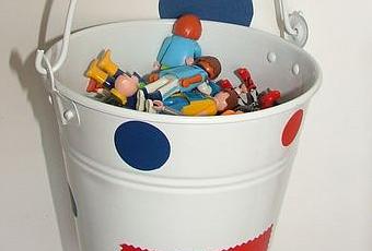 Voici une idée déco à réaliser soi-même que je trouve sympa et originale pour ranger les jouets dans la chambre des enfants. Il s'agit de boîtes en fer, décorées et suspendues par des crochets à une barre.