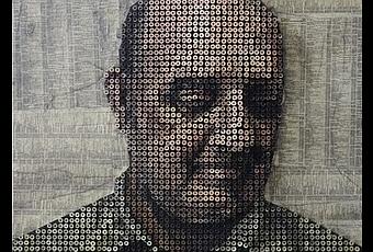 Et bien Andrew Myers l’a fait. Son travail est astucieux et terriblement rigoureux basé sur un concept simple mais extrêmement minutieux. Sur une base en contreplaquée sont collées des pages de bottin, un visage est ensuite dessiné, percé puis vissé par des milliers de vis pour donner cet effet en relief.
