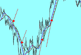 Quand la moyenne 50 se trouve entre les moyennes 40 et 60 je me trouve en tendance ou à la hausse ou à la baisse si le prix suit dessous au-dessus.