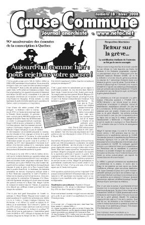 Le numéro 18 de Cause commune, le journal de la NEFAC au Québec, est maintenant disponible sur le web. 4000 exemplaires papier de ce journal sont distribués gratuitement par des militantEs libertaires, membres ou non de l’organisation. Cause commune se veut un tremplin pour les idées anarchistes, en appui aux mouvements de résistance contre les patrons, les proprios et leurs alliés au gouvernement. Si le journal vous plaît et que vous voulez aider à le diffuser dans votre milieu, contactez le collectif de la NEFAC le plus près de vous.