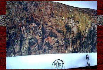 En haut de l’escalier, on reçoit la lumière en face par la baie vitrée et le regard fait le tour des murs où sont accrochées des œuvres de Christian Sabas. J’étais monté pour voir Les Passagères (ci-contre, à droite), sculptures de Mioko Tanaka et Soline Portman, et ce sont les peintures et encres d’un autre artiste qui arrêtent mon pas. Des foules qui se pressent, des hommes et des femmes en mouvement, peut-être des scènes de danse ou de musique, grands formats pour les peintures, plus petits pour les encres. Je partage avec ces gens qui semblent venir vers moi quelques instants avant de redescendre portant en moi ces images, étranges cérémonies…