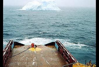 Remorquage d’un petit iceberg en mer du Labrador. Ce type d’opération est courant au large de Terre-Neuve, sur ‘Iceberg Alley’. Le but : dévier les icebergs de leurs trajectoires, pour éviter que l’une des plateformes pétrolières des Grands Bancs ne connaisse le même sort que le Titanic.