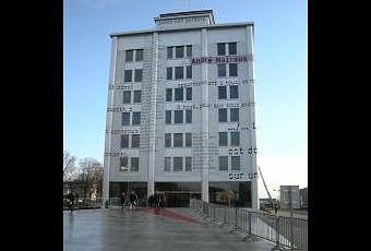 L’entrepôt se voit rehaussé de trois niveaux, allongé, dépouillé de son parement extérieur, de sa toiture et habillé d’une structure en verre, dans le prolongement exact du silo. A l’intérieur, celui-ci a été vidé et constitue un hall d’entrée avec un surplomb de près de trente mètres. Le béton brut existant a été valorisé en étant recouvert de résine brillante, de façon à conserver les cicatrices du vécu du bâtiment industriel. Les espaces sont parcourus par un ruban rouge, sorte de fil conducteur, déployé en angles vifs sur les sols, les plafonds et les rayonnages, à travers tout le bâtiment.