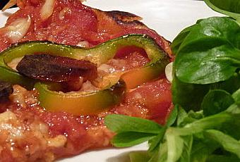 Découper le chorizo et le poivron en rondelles et le répartir sur toute la pizza.