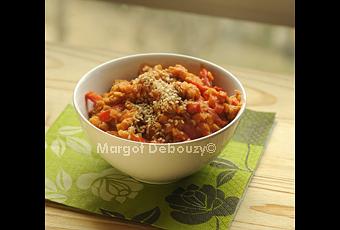 50g de protéine de soja texturée morceaux de taille moyenne20cl de sauce tomate1 petit oignon1 poivron rouge30cl de bouillon de légumes (ou d'eau)1 cuillère à café de cumin en poudre1 pincée de thymLa veille : plongez les protéines de soja dans un bol d'eau et laissez 24h au réfrigérateur.Aujourd'hui : égouttez les.émincez le poivron en lanières, hachez finement l'oignon.Procédez exactement comme pour un risotto :Faites suer l'oignon dans l'huile d'olive chaude durant 3mn.Ajoutez les lentilles, le poivron, le thym et le cumin. Remuez 3min.Ajoutez l'eau ou le bouillon de légumes (30cl) et laissez cuire tranquillement, à petit feu, 20 mn environ. N'hésitez pas à venir vérifier et remuer de temps à autre.Ajoutez la sauce tomate et les protéines de soja égouttées. Laissez cuire encore à petit feu durant 20 mn environ. La préparation doit réduire progressivement sans accrocher au fond.Lorsque c'est de texture épaisse, les lentilles ont explosé et ne sont plus clairement identifiables, vérifiez l'assaisonnement et servez. Perso, j'ai servi avec une grosse cuillère à soupe de grains de sésame écrasés "minute" par personne.