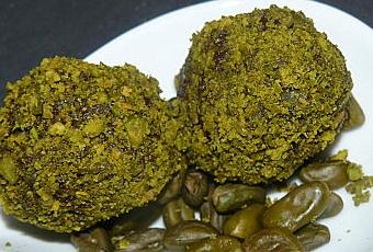 Former entre vos mains (mouillés) des petites boules de pâte que vous roulerez dans les pistaches réduites en poudre.