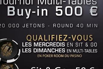 Satellite le mercredi 16 mars. Buy-in : 50 €.3000 jetons. Niveaux de 20 mn.