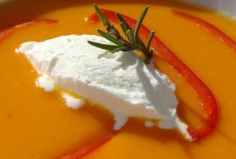Voici un velouté haut en couleurs et en saveurs comme je les aime tant. La texture est très veloutée, la quenelle de chantilly à l’ail apporte un brin de pimpante douceur, les rondelles de chorizo grillées cachées dans le fond de l’assiette s’accordent à merveille avec la saveur du poivron et enfin les fines lanières de poivron cru en déco donnent une note craquante très agréable. Bref, une entrée en matière qui a tout pour séduire ! (source : un vieux maxi cuisine)