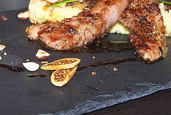 Dressez vos assiettes. Nappez les aiguillettes de sauce à la figues et parsemez la polenta de noisettes concassées.