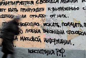 En passant près du Kremlin (et plus précisément Лебяжий пер., 6/1, под Каменным мостом), le photographe moscovite Vasily Maximov a pris un cliché de ce graffiti reprenant textuellement l'article 29 de la Constitution russe.