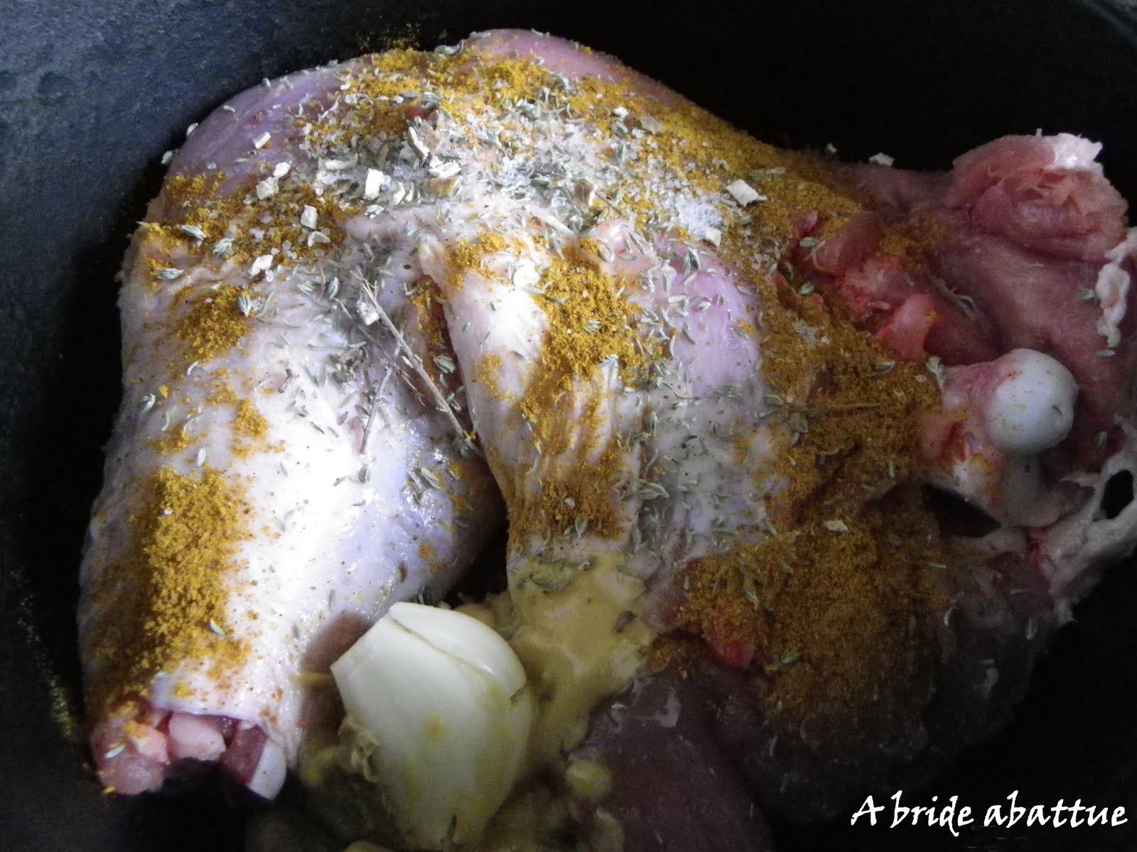 J'ignore où les pigeons du quartier ont passé l'hiver. Nous étions tranquille et voici qu'un énorme oiseau fait ployer une branche d'arbre juste en face de ma fenêtre. Il se gave de bourgeons et le voir m'ouvre l'appétit. J'ai furieusement envie d'une pastilla.A défaut de pigeon c'est une cuisse de dinde que je vais rôtir (c'est d'ailleurs plus économique), simplement posée sur un oignon haché et deux gousses d'ail aplaties dans une cocotte de fonte. J'ajoute du vinaigre, de la sauce soja, de la moutarde, du miel, du sel et du poivre, une cuillerée à café de raz-el-hanout comme au Maroc, du thym et du laurier bien de chez nous.