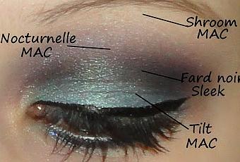 Voilà ce que j'ai utilisé :Primer Potion d'Urban DecayGel liner Envious de CS en base colorée sur la paupière mobileTilt de MAC sur la paupière mobile et en ras de cil inférieurFard noir des palettes Sleek en bananeNocturnelle de MAC pour flouter le fard noirShroom de MAC en touche lumièrePlumage de MAC en ras de cil inférieurLiquid Eyeliner Chameleon de LA Splash en ras de cil inférieurFeutre eyeliner Black de EyekoAqua Eye Black de MUFE sur la muqueuseMascara Doll Eye Long Lash de NYX
