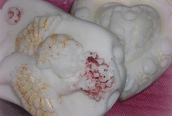 Ingrédients de la recette pour le coeur :96 grammes de bicarbonate de soude24 grammes de SLSA33 grammes de beurre de karité ajouts:7 gouttes d'absolue de narcissemoule ICImica or