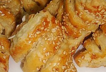 Enrouler chaque bande autour des cornets. Placer les sur une plaque recouverte de papier de cuisson puis badigeonner les et saupoudrer de graines de sésame et mettre à cuire dans un four préchauffé à 180°C jusqu'à ce qu'ils deviennent dorés.